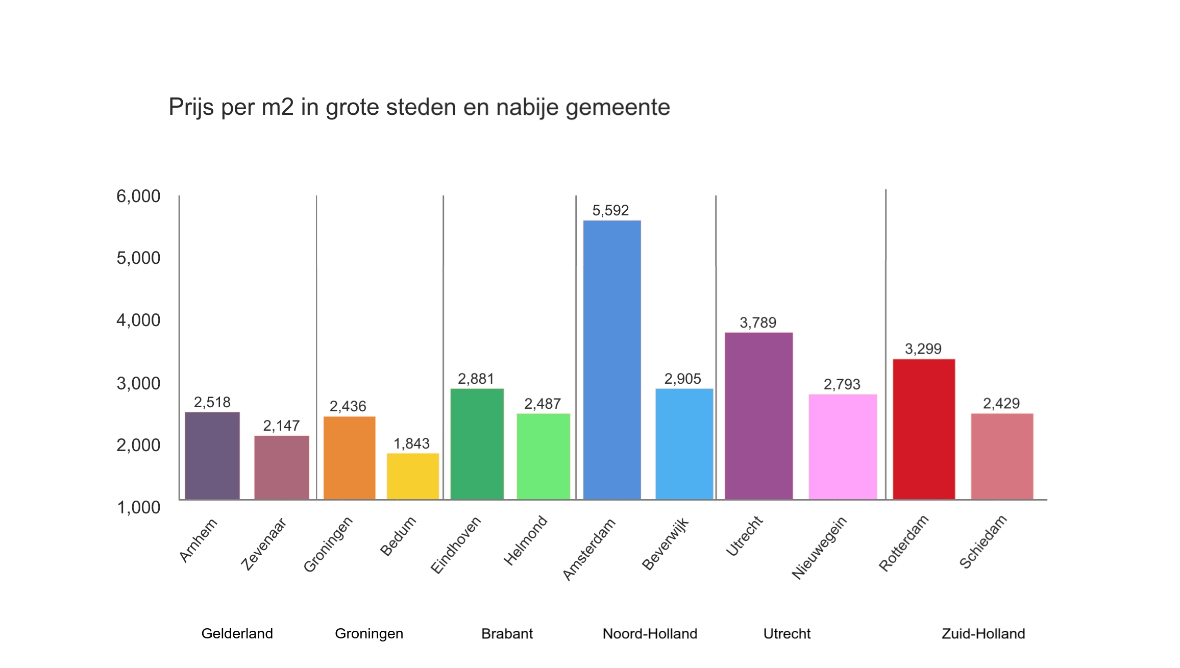 In de onderstaande tabel zie je de prijs per vierkante meter in de grote steden en een goedkoper alternatief in een straal van 20km. Alleen het alternatief in Noord-Holland ligt wat verder. Dichtbij Amsterdam zijn simpelweg weinig goedkope gemeenten te vinden.